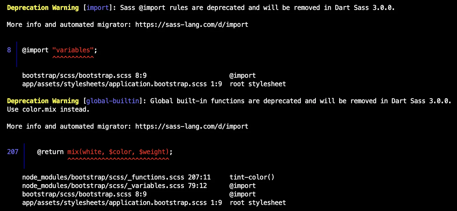 rails new <app> --css bootstrap, aber die Erfahrung ist alles andere als reibungslos. Das Erstellen eines neuen Projekts führt zu Tausenden von Deprecation Warnings, was auf eine veraltete Integration hindeutet, die mit modernen CSS-Workflows nicht Schritt hält.