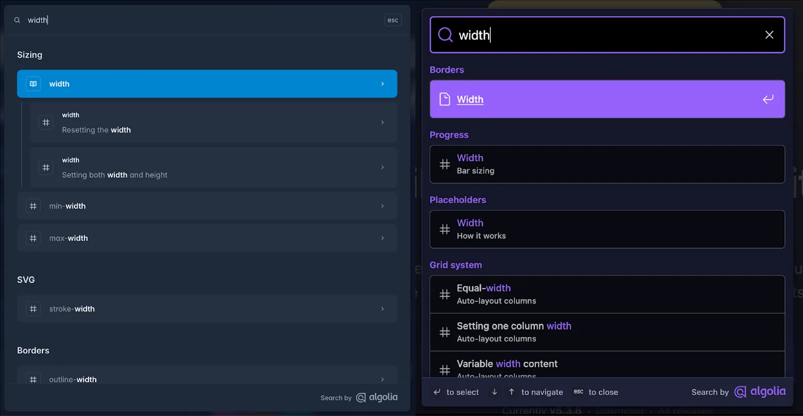 Die Suche nach "width" in Tailwind (links) zeigt die Seite für die Element-Width. Bootstrap (rechts) zeigt stattdessen die Border-Width und die Progress-Bar-Width an.
